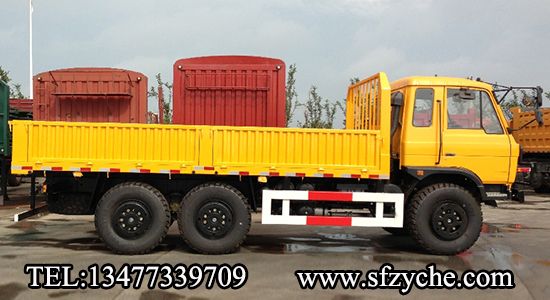 2、詳細(xì)配置:平頭一排半駕駛室,6*6驅(qū)動,康明斯190馬力,韶齒6檔變速箱,斷氣彈簧制動,貫通式中后驅(qū)動橋,12.5R20越野胎,軸距 3500+1250mm,加厚雙層大梁,貨箱4850mm,帶軍用保險杠。(新款仿天錦駕駛室加價1.5萬元)東風(fēng)越野卡車:www.a9s5.com